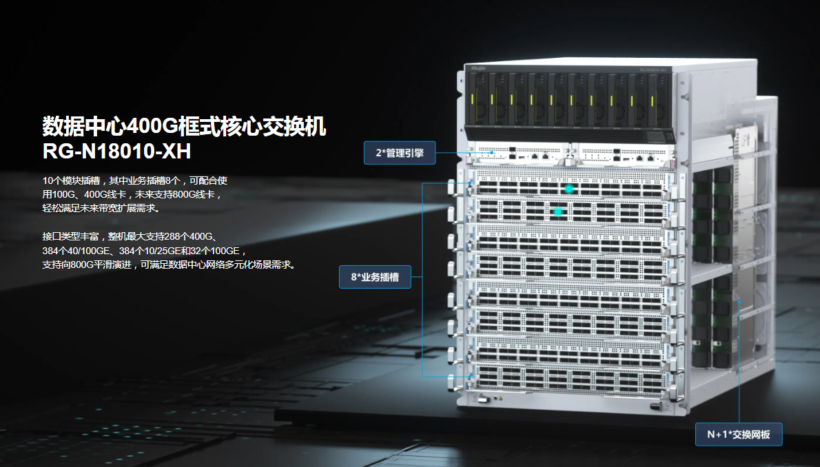 ● 支持100G、400G线卡,整机最大可提供288个400G、384个40/100GE、384个10/25GE和32个100GE线速端口